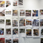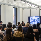 Students viewing pinned work in studio