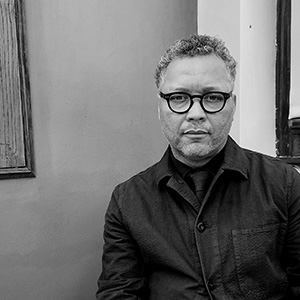 A man with short curly salt-and-pepper hair and light stubble. He has black framed glasses and is wearing a black button down shirt.