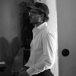 A man standing in side profile; he has wavy brown hair and stubble and is wearing a baseball cap, black-rimmed glasses and a white button-down shirt.