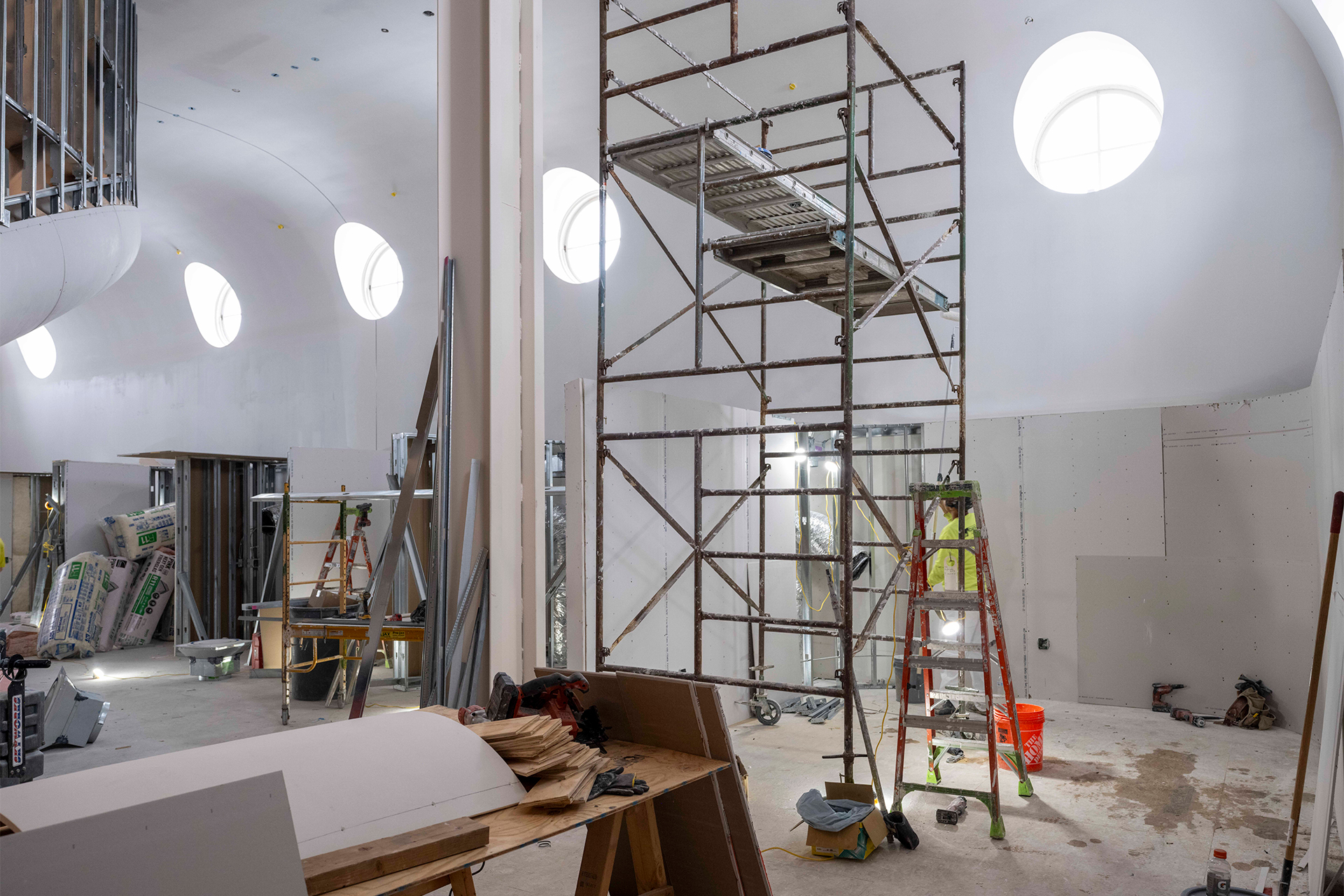 On Sibley Dome’s third floor, construction has begun on the banquet walls that frame a new seating area for AAP students to congregate, blending original character with new functionality.