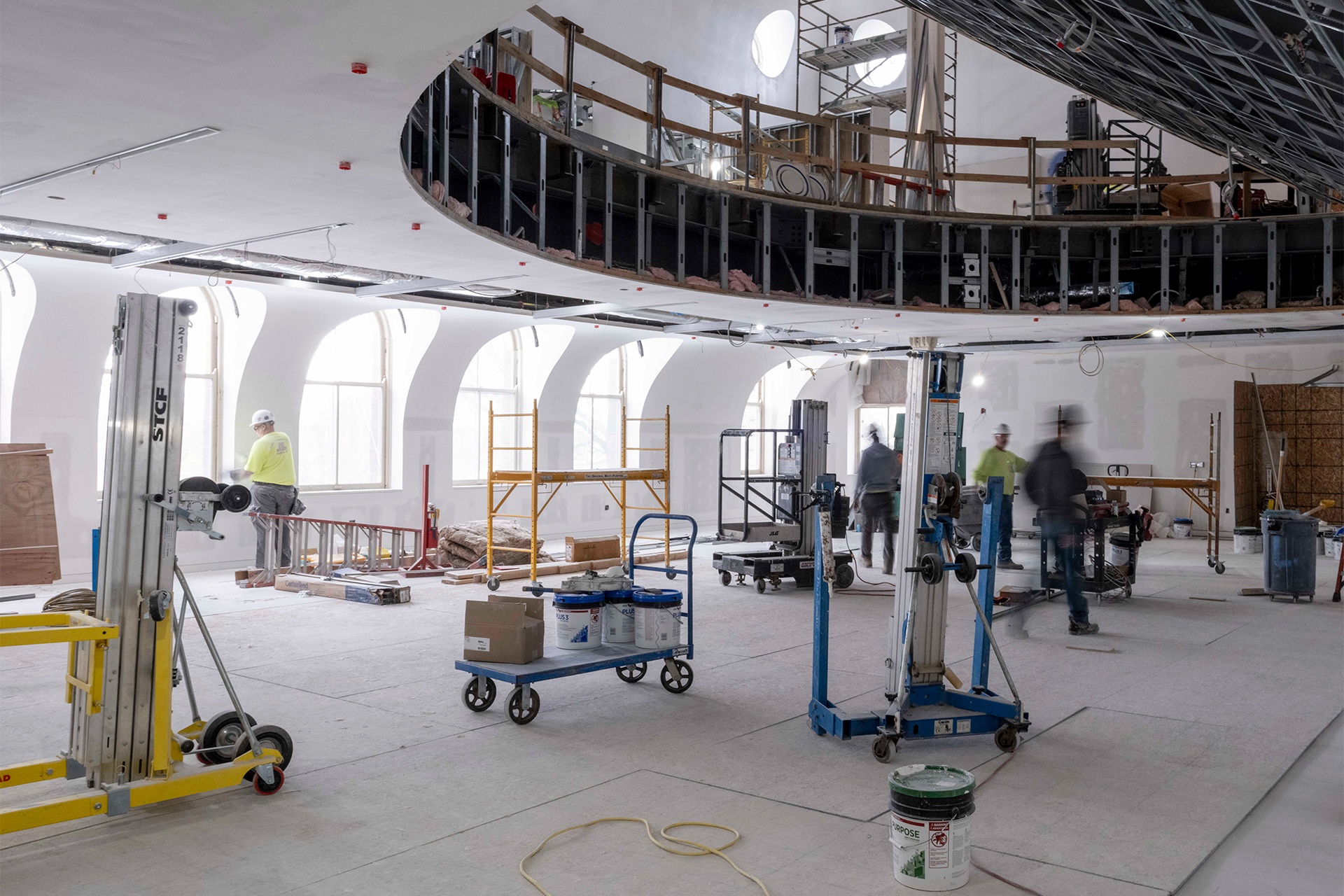 A unique view of the underside of the in-progress auditorium floor from the future third-floor banquet seating area in Sibley Dome. The transformation introduces contemporary engineering into the space’s historic framework.