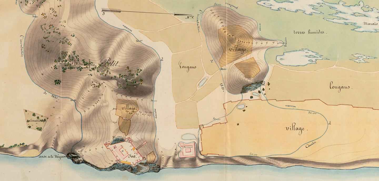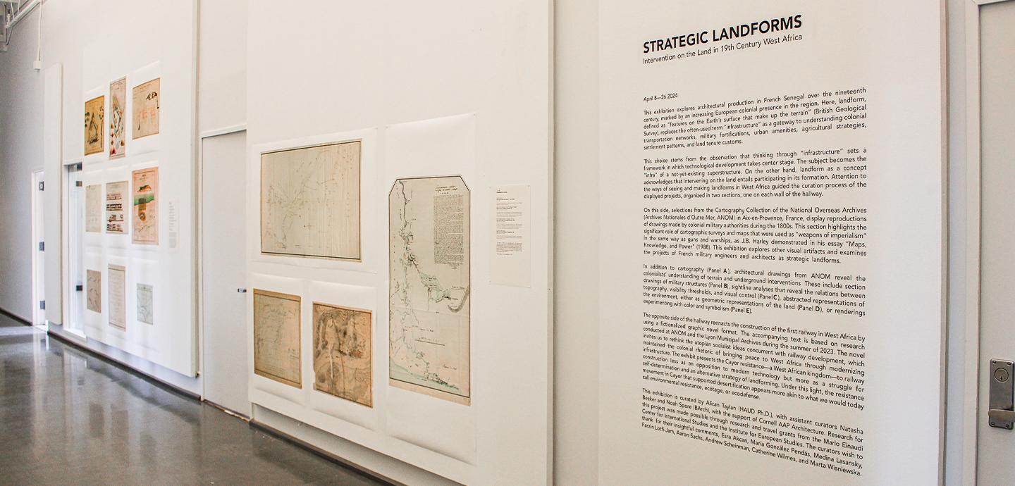 One side of East Sibley Hallway displays reproductions of drawings made by colonial military authorities during the 1800s. Categorized in five panels, the drawings reveal the importance of colonialists' understanding of the terrain and underground interventions, topography, visibility thresholds, and abstract representation of the environment.