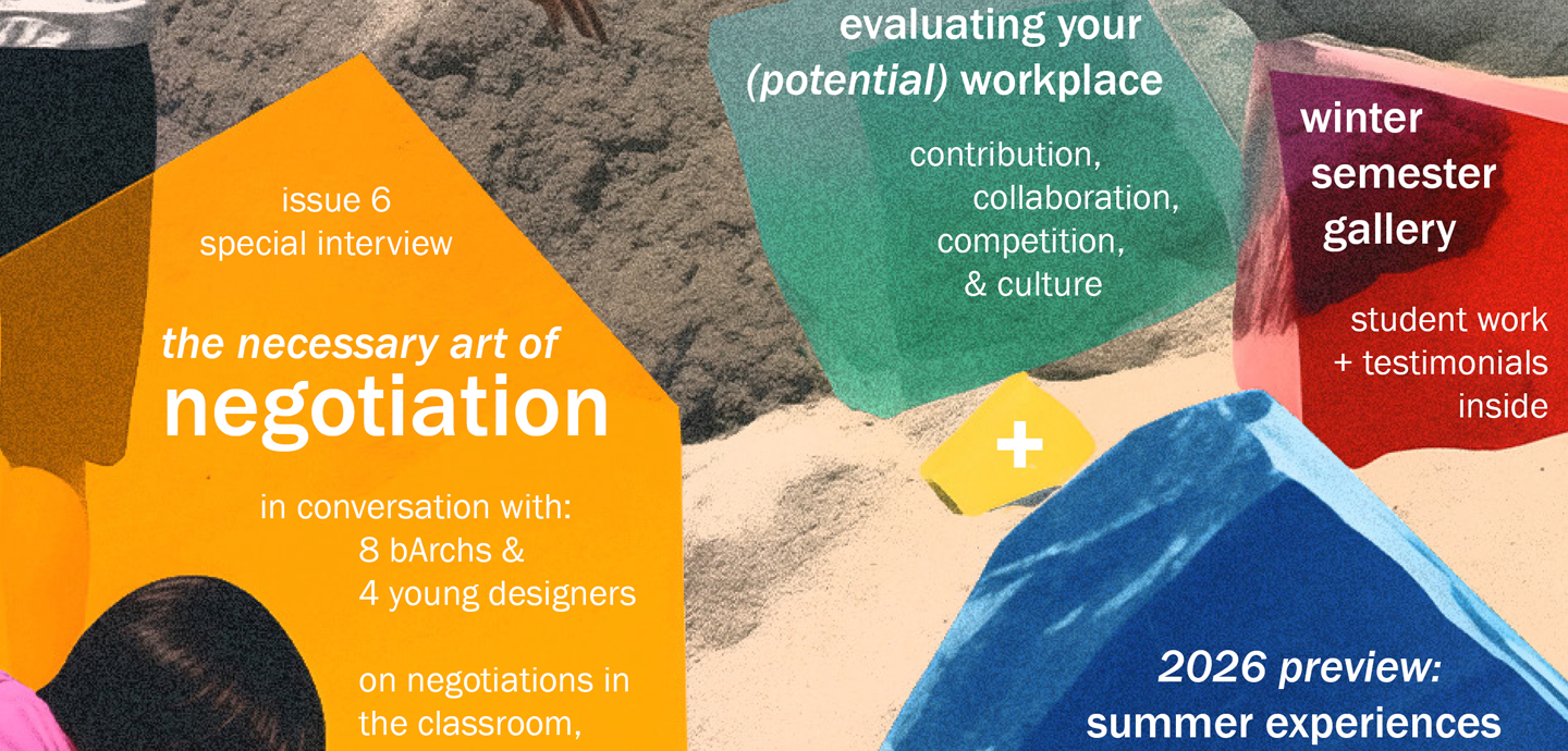 Students in the Spring 2025 ARCH 5201 Professional Practice elective taught by Department of Architecture Lecturer Hanna Tulis have imagined the future they want to see in the profession and the discipline more broadly. Considering ethical, legal, financial, ideological, and aspirational frameworks, they have composed a 180-word oath expressing a commitment to the future of the profession and visualization in the form of a cover page for a future professional publication. Inspired by the oaths of other professional guilds, what might architects recite upon graduation or licensure? What values need fortification? What matters now more than ever?