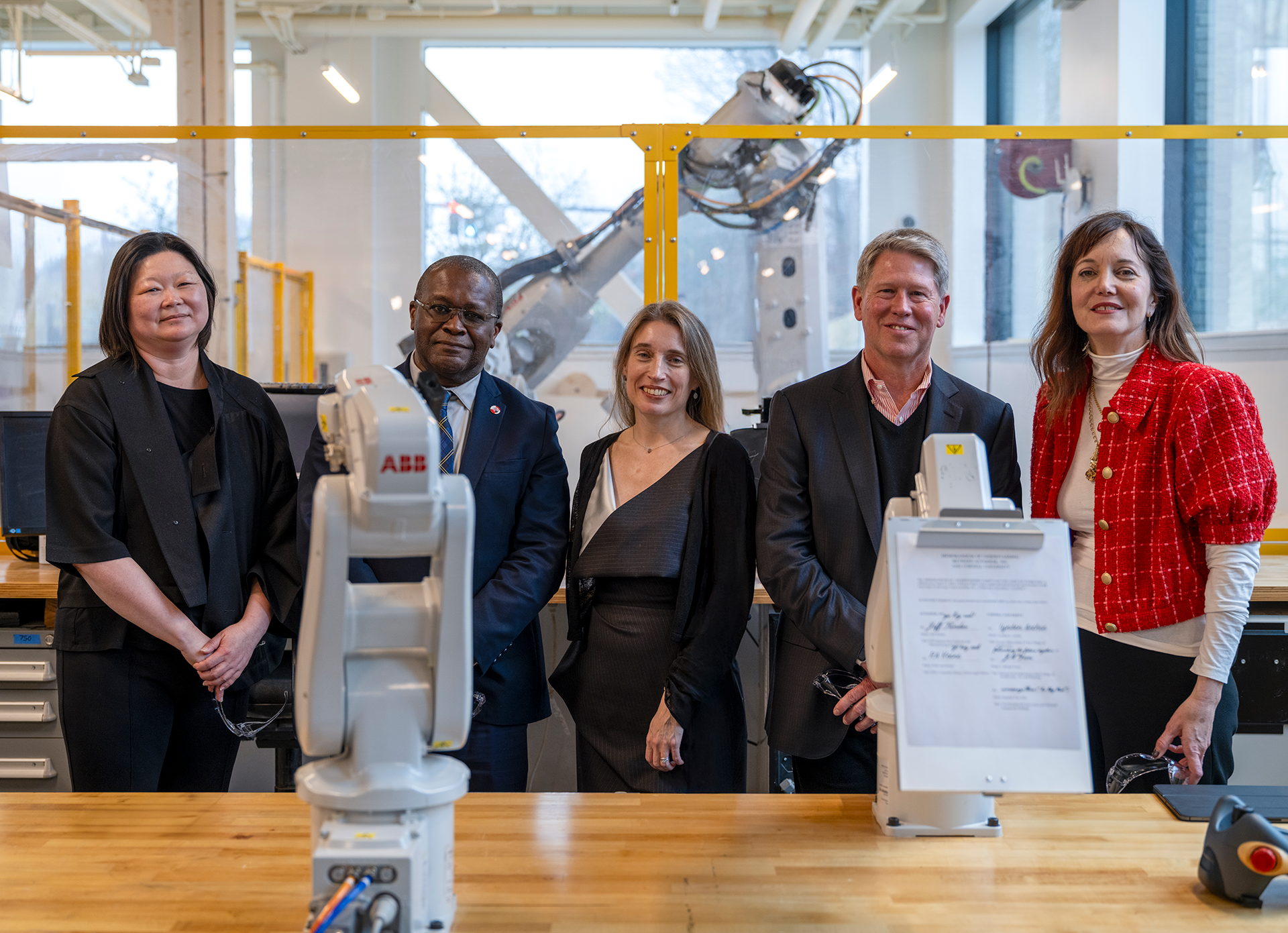 From left: Cornell's J. Meejin Yoon, Gale and Ira Drukier Dean of Architecture, Art, and Planning; Lynden A. Archer, Joseph Silbert Dean of Engineering; and Krystyn Van Vliet, Vice President for Innovation and External Engagement Strategy, join Autodesk's Jeff Kinder, Executive Vice President of Product Development and Manufacturing Solutions, and Ruth Ann Keene, Executive Vice President of Corporate Affairs and Chief Legal Officer, for the official signing of the memorandum of understanding facilitated by robotic arms in AAP's Autodesk Design and Make Space. Anson Wigner / AAP