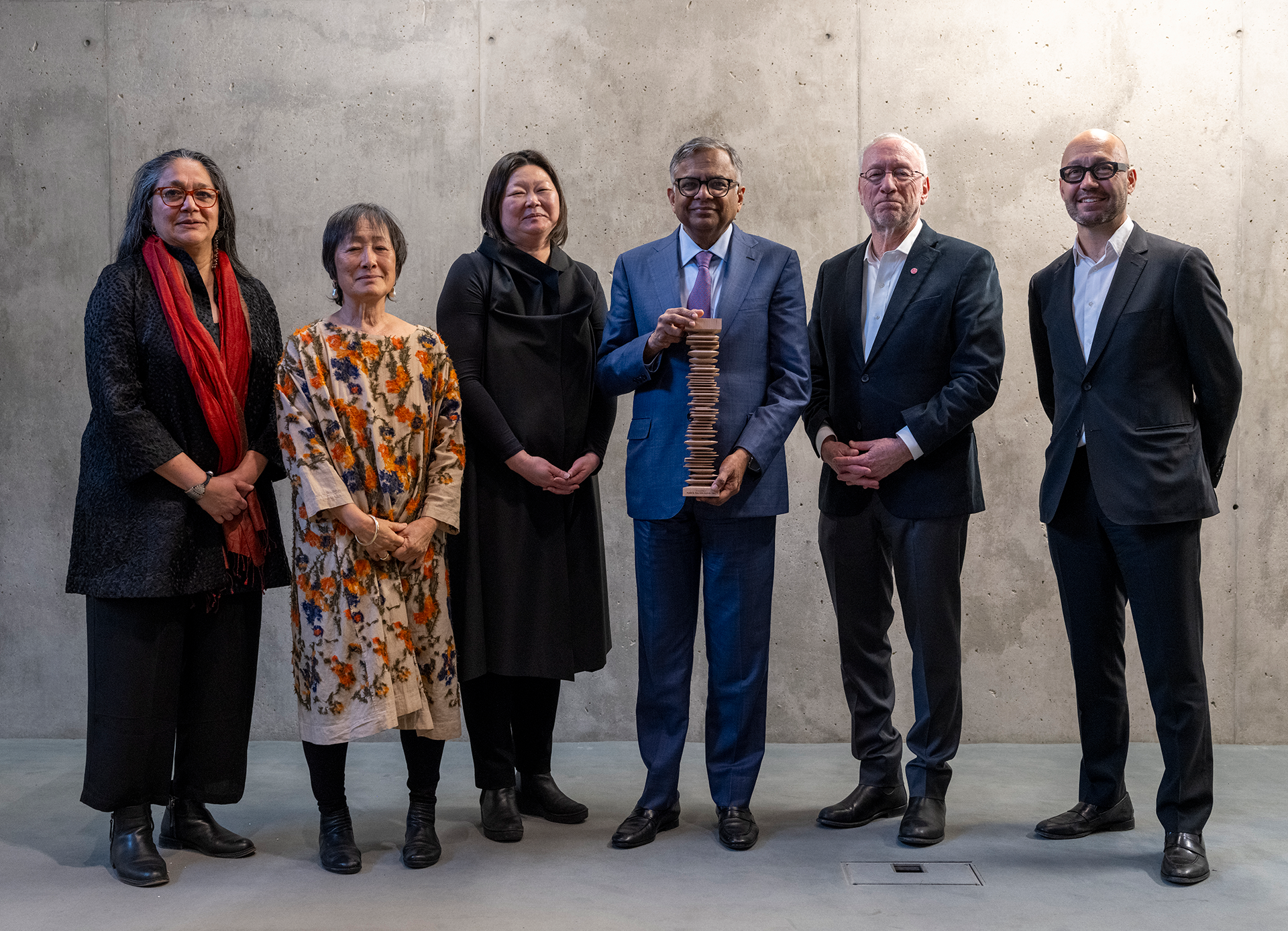 Following Tsien's remarks, Yoon presented the award, engraved on the base of a cherrywood model designed by first-year architecture student Blake Zimmerman (B.Arch. '29), to Natarajan Chandrasekaran, Chairman of Tata Sons, who accepted on Tata's behalf and shared with the gathered audience insights into a more private side of Tata. "He was a very quiet person, and he was a person to be discovered. He was never a person who just spoke a lot of words and said anything that came to mind," Chandrasekaran said of his former boss, mentor, and dear friend. "I feel in a way he was a person of many kinds. He was an architect, he was a businessman, he was a philanthropist, he was a dog lover, he was a compassionate human being, and many other things, but that's why I think he was one of a kind."