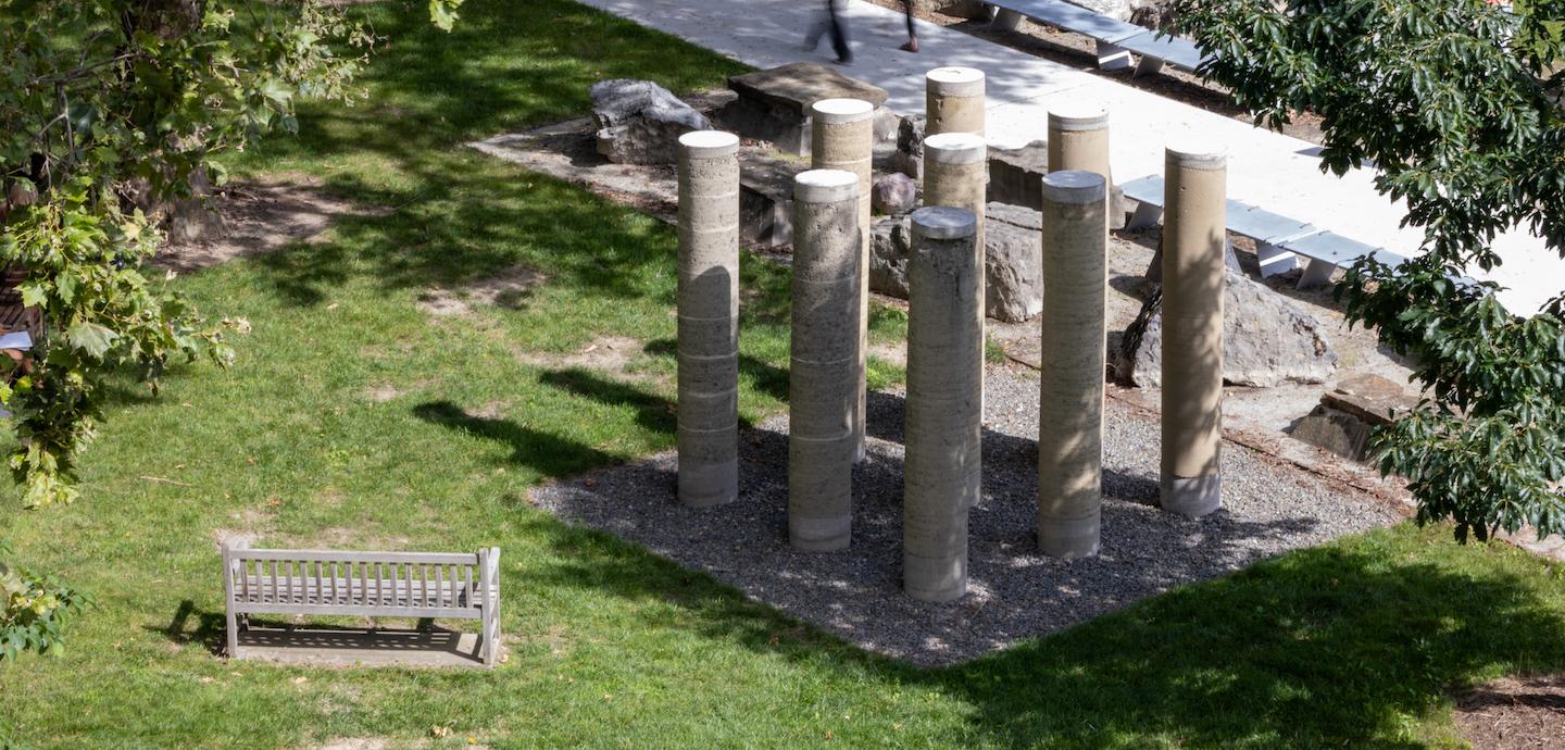 Terra Firma: NewGrounds is an installation by Architecture Lecturer Marta H. Wisniewska and Regenerative Architecture Lab members Maxwell Rodencal, Project Lead (M.Arch. '23), Julian Helbling (B.Arch. '25), and Jesus Mayen (B.Arch. '26) that demonstrates how an ancient construction technique — rammed earth — can contribute to the decarbonization of the building industry. Nine earthen monoliths, eighteen inches in diameter and eight feet tall, are arranged in a three-by-three matrix. Each cylinder has a slightly different material composition of aggregate (stone/gravel) and lime (naturally occurring alternative to cement). Exposed to the elements over the course of several months, each cylinder is weathering differently, making the various engineered compositions of soil visible. The design concept of cylinders references compressive strength testing methods in structural engineering laboratories, a crucial process in learning about and regulating new and existing materials for structures.