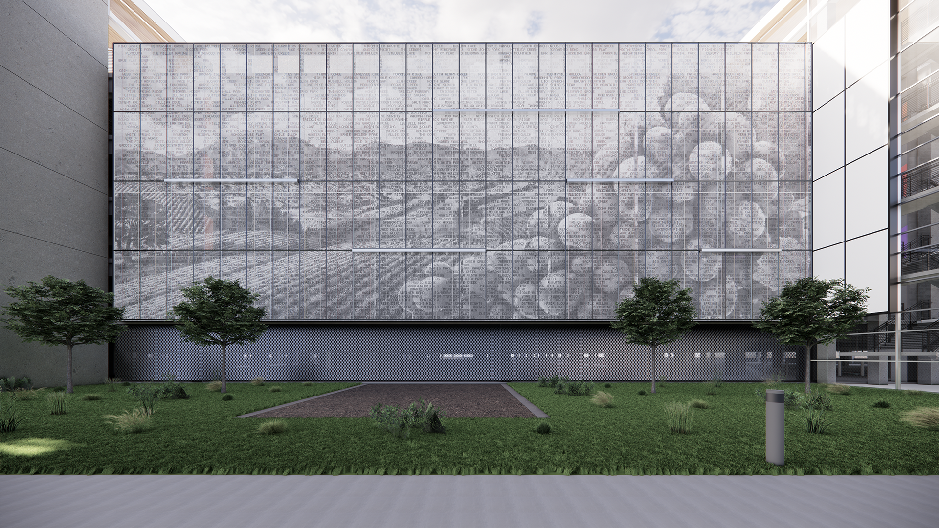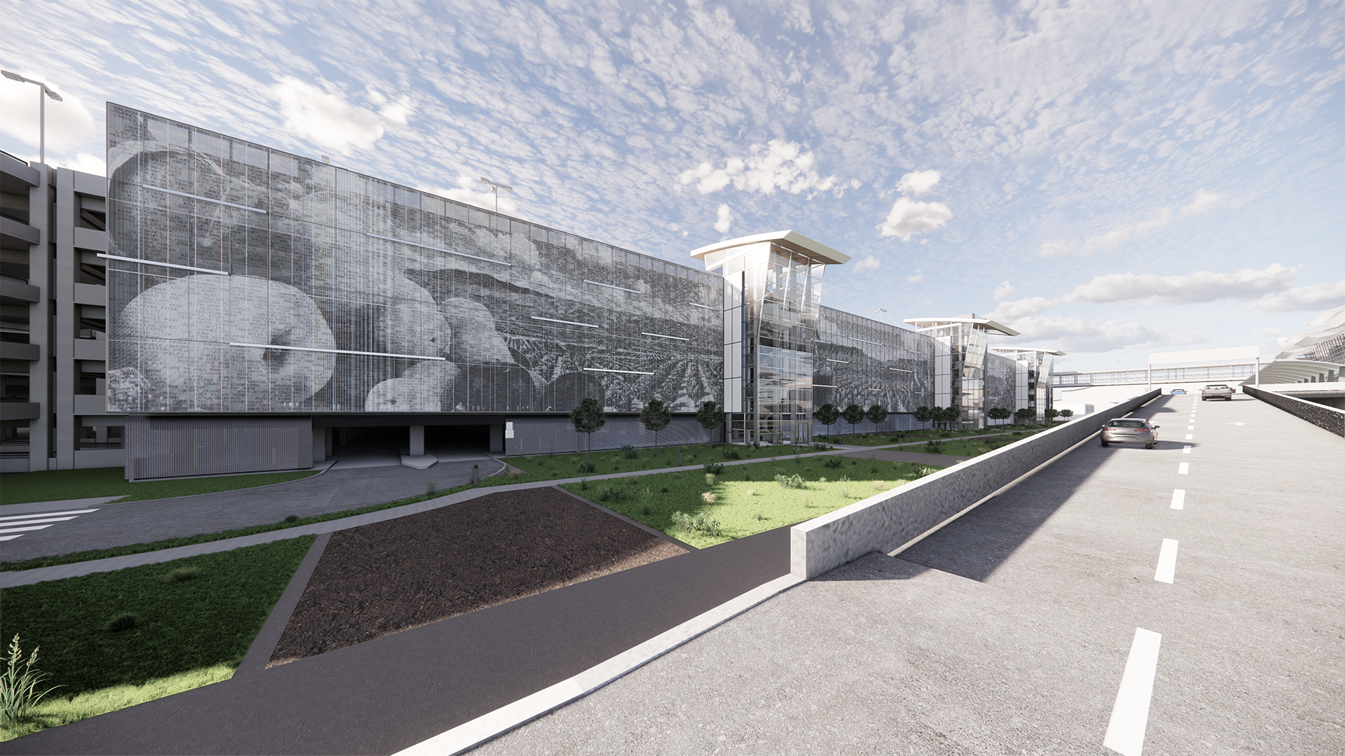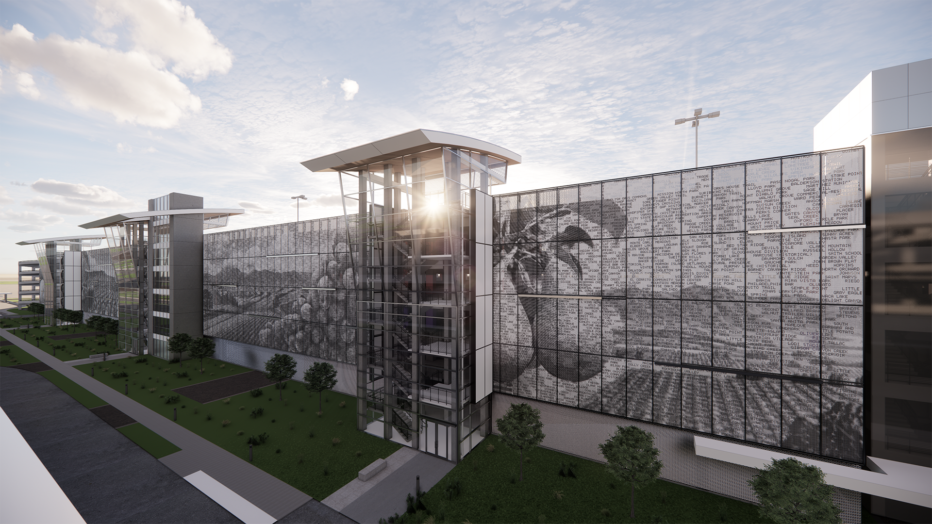Using 1,252 perforated metal panels each measuring 3’x11′, Paul Ramírez Jonas, Chair and Professor of Art in Cornell’s College of Architecture, Art, and Planning, has unveiled his plans for a large-scale installation which will cover three sides of Sacramento International Airport’s new six-story parking garage.