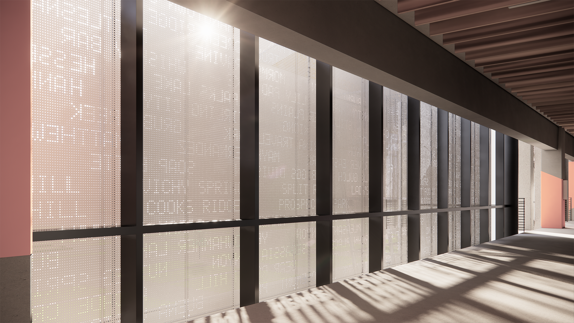Titled The Trip Around the Block is the Trip Around the World, the commissioned work invites airport users to reflect on the surrounding region’s agricultural landscape at multiple scales. Holes punched into the panels spell out the names of local environmental features — everything from coves and creeks to forests and mountains — and incorporate every airport employee’s name. From a distance, the punctures create an optical illusion that depicts the orchards of the Sacramento Valley on the building’s exterior. Internally, the play of sunlight and 60 installed sconces adds another dynamic dimension to the work, which is expected to measure approximately 45’x400′ in full.