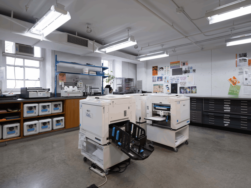 Dedicated to publishing, the shop includes three RISO printers, 19 colors, stack cutters, a range of different binding machines, and many more tools. Students can make stickers, postcards, posters, zines, short run books, and prints, among other media.