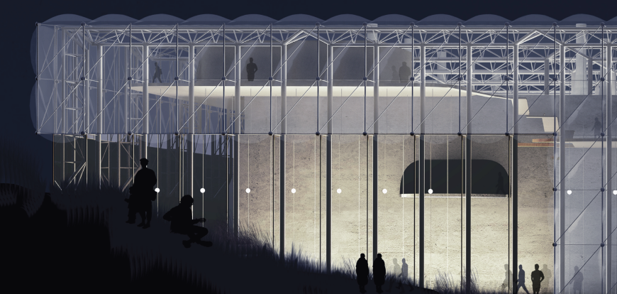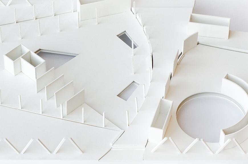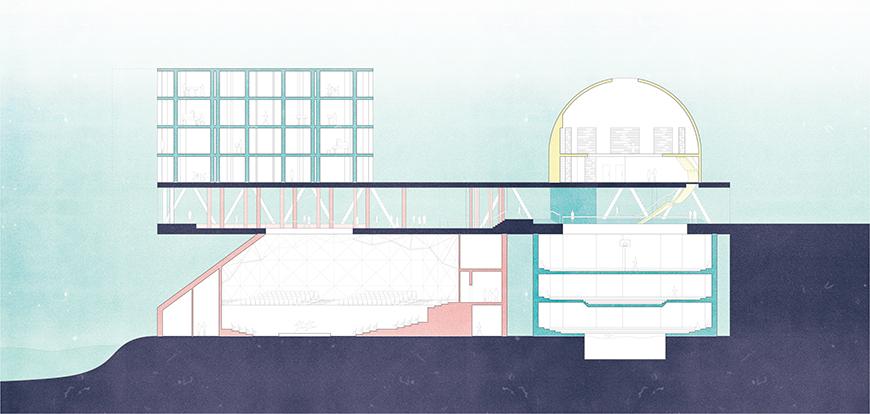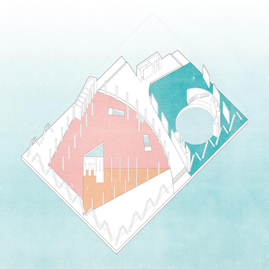 Located in the historic music city of Rochester, New York, this project works to bridge the connection between students of the music school and the people of the city through the creation of a slab functioning as a large community space and as circulation for the school. Each of the volumes above and below the slab were assigned an idealized shape based on the nature of the activities occurring within each volume. They all come together with their impression in a shared space. Overall, the music school emphasizes the expression of difference and shared space through the creation of an experience of common ground, allowing for different groups of people to come together before they depart towards their own paths.