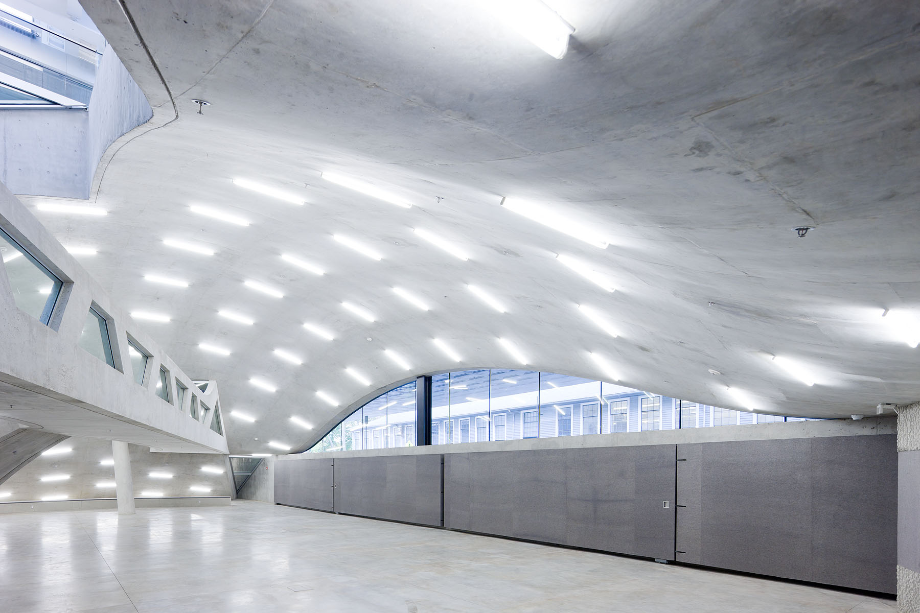 Milstein Hall's lower plate is a cluster of public programmable areas — auditorium, exhibition, and critique spaces — that serve all of AAP in conjunction with the upper plate. Constructed of cast-in-place concrete set into the site, the roof provides a public exterior plaza with a single manipulation that rises to form a bump creating access from the ground to the upper plate, a domed public space, and tiered seating for the auditorium.