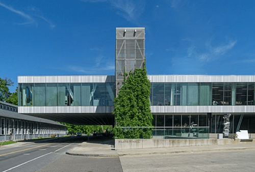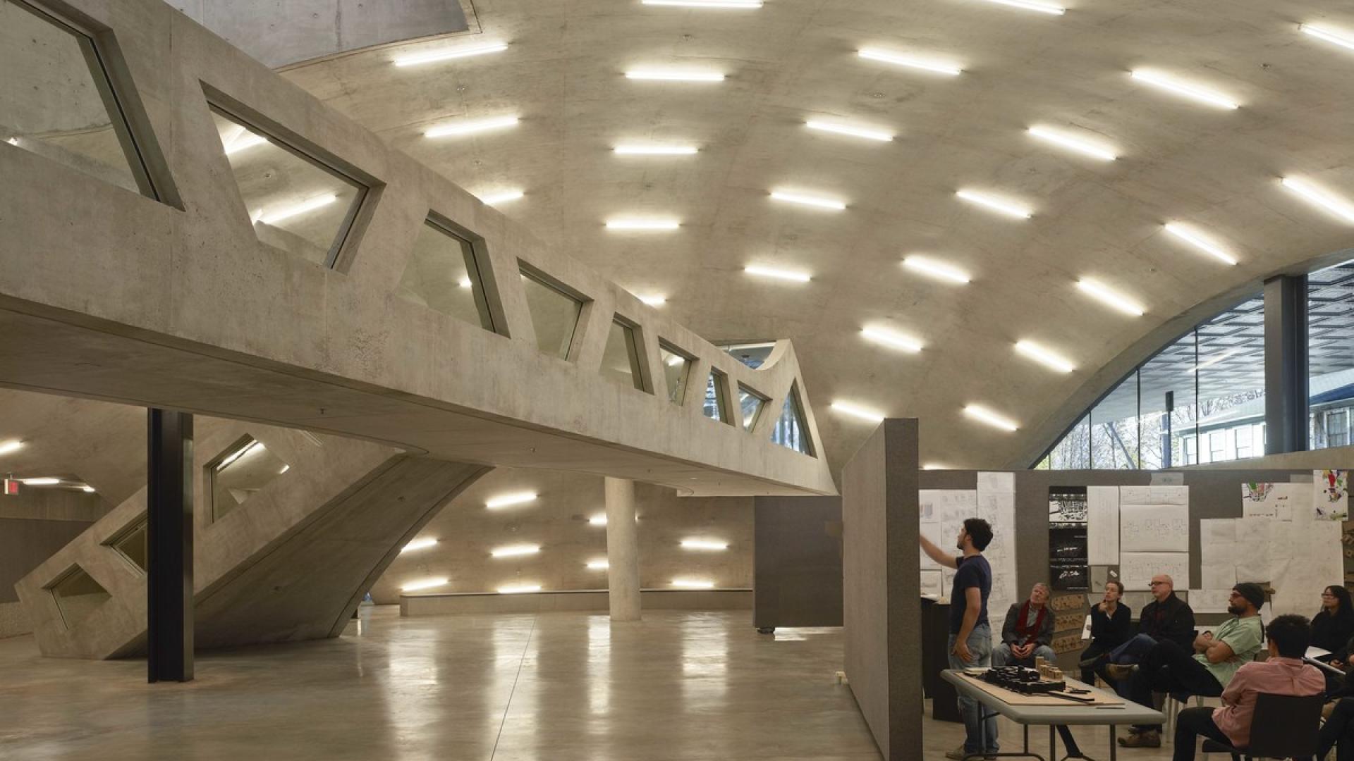 The design includes an elevated second floor that provides flexible contiguous studio space and connections to Sibley and Rand halls. The structure is cantilevered on the north side and southeast corner with the space underneath left open to form a pedestrian plaza that provides outdoor gathering and exhibition space protected from the elements, and a sheltered pedestrian connection to the studios located in The Foundry. The concrete dome in the center provides the incline for the auditorium seating; supports stairs to the second-floor studio space; and creates a ceiling for the critique space below. In the sub-basement underneath the plaza there is an auditorium, exhibition space, and critique area.