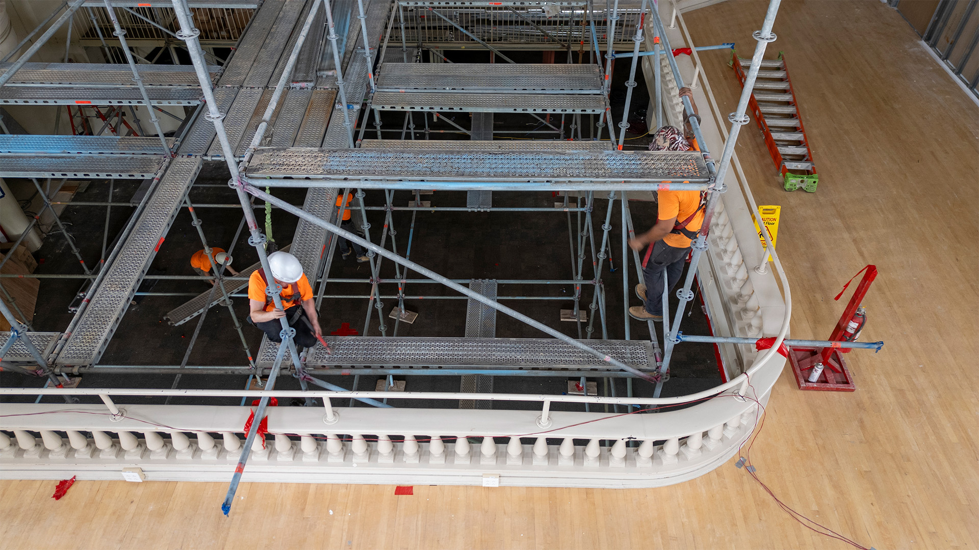 Scaffolding and other preparations are underway as demolition activities begin on the third floor of Sibley Hall.