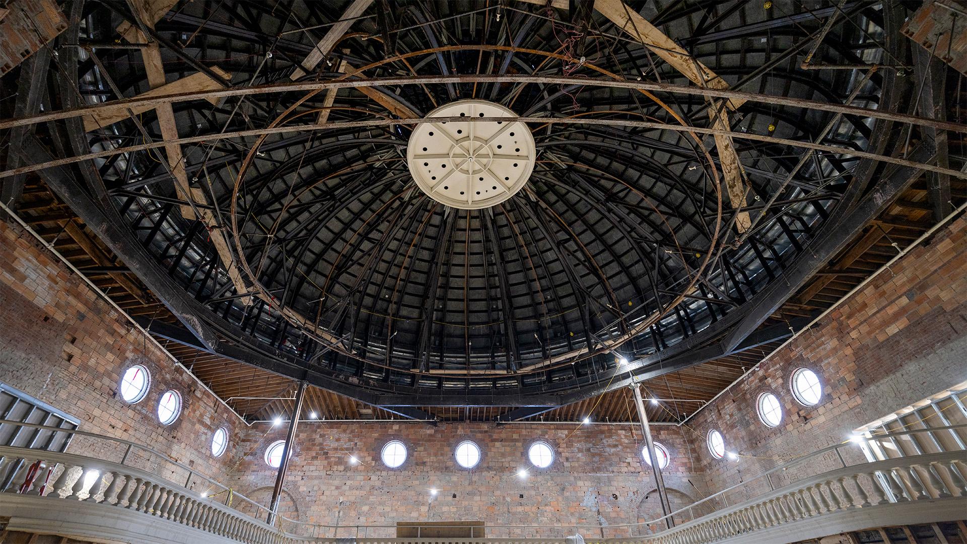 Following demolition and asbestos abatement, an interior view reveals the space's original bones. The stripped-down circular gallery shows the historic masonry walls, ornate railing details, and clerestory windows.