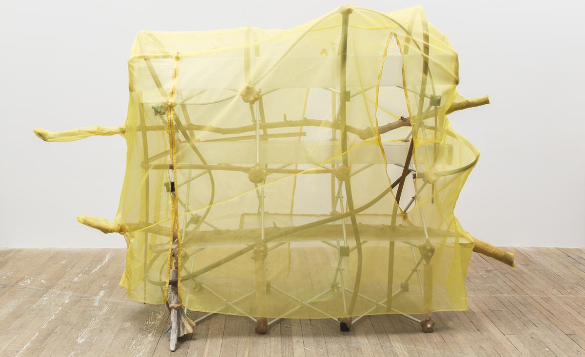 Walking up was getting into discipline, nyc stick shelf (2019), metal, plexiglass, sawdust, wood glue, plastic, nyc stick, fabric and zippers, 681/2" × 99" × 32". photo / Gregory Carideo, © Jessi Reaves, courtesy of the artist and Bridget Donahue, NYC