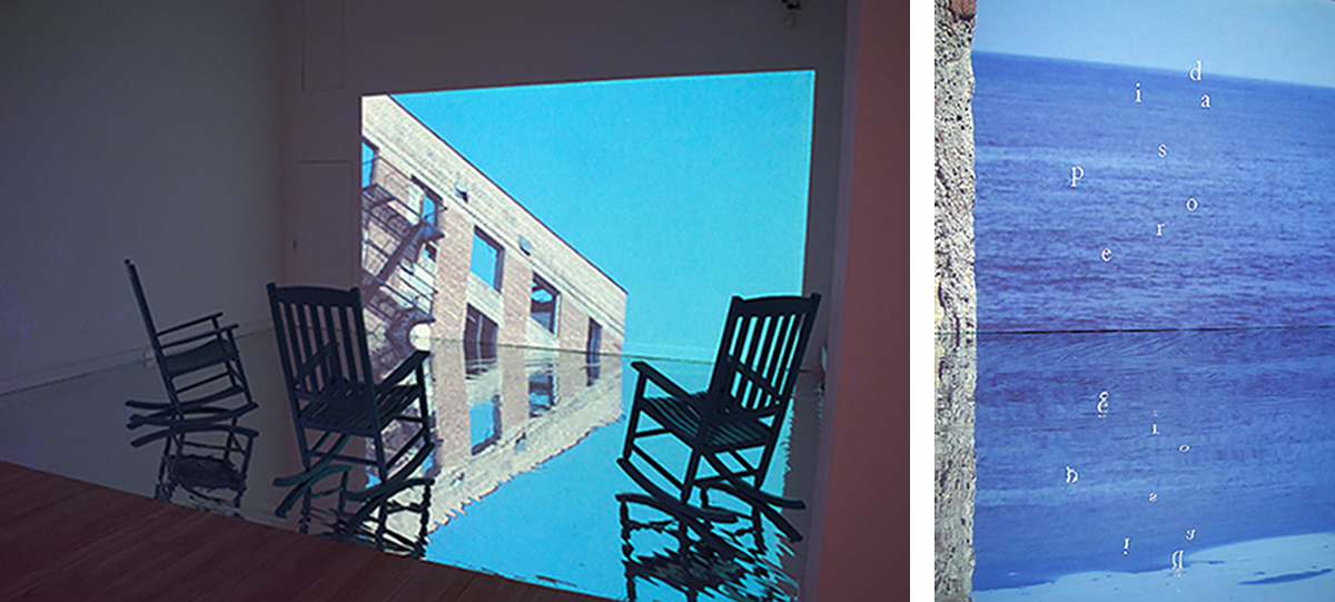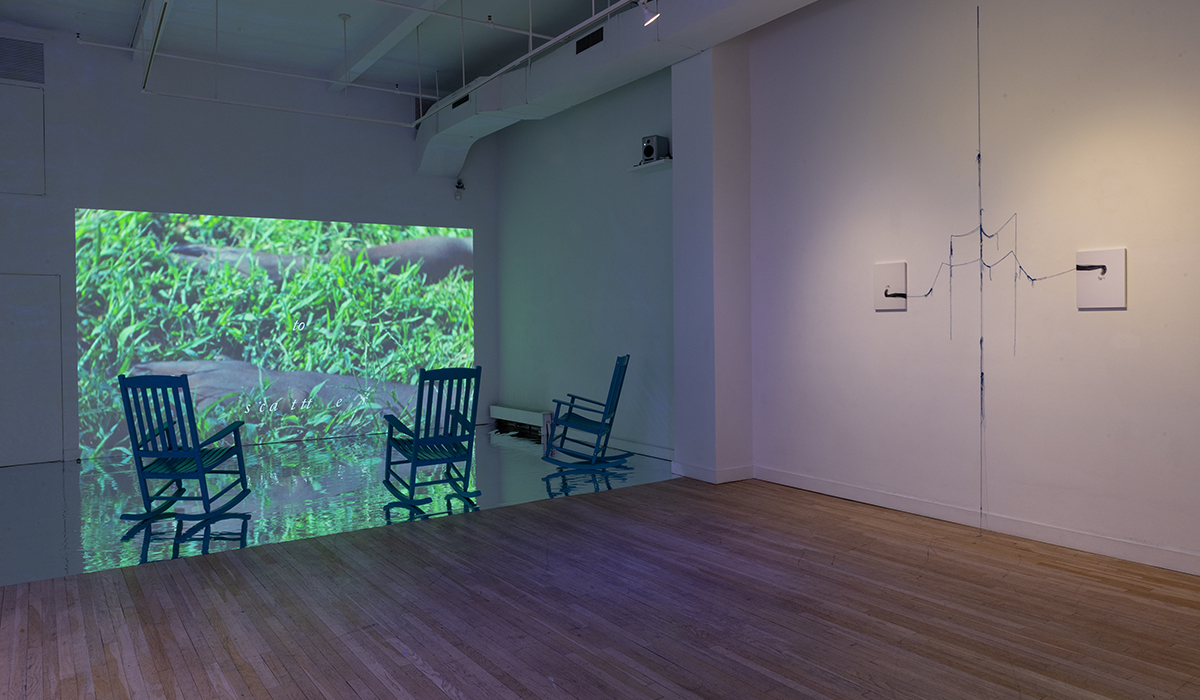 Installation views at CUE Art Foundation, New York City. Left: SHE GATHER ME (2021), HD color video and 16mm color film transferred to video with two-channel audio, three wooden rocking chairs, silver mylar floor. Right: SHE GATHER ME (2021), detail. The title is taken from a character and dialogue in Toni Morrison's 1987 novel, Beloved. images / provided