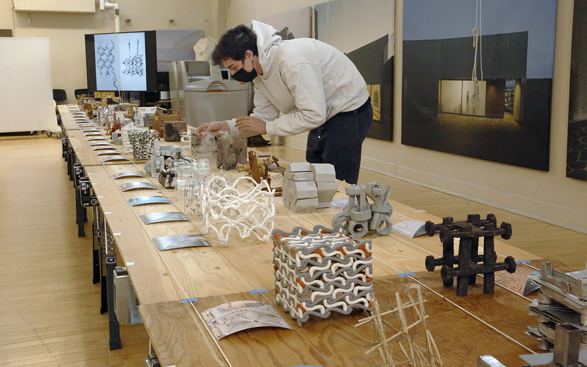 First-year B.Arch. students display their models for the 2021 Edward Palmer York Memorial Prize competition and exhibition in the central second-floor work and critique space in Sibley Dome. photo / William Staffeld AAP