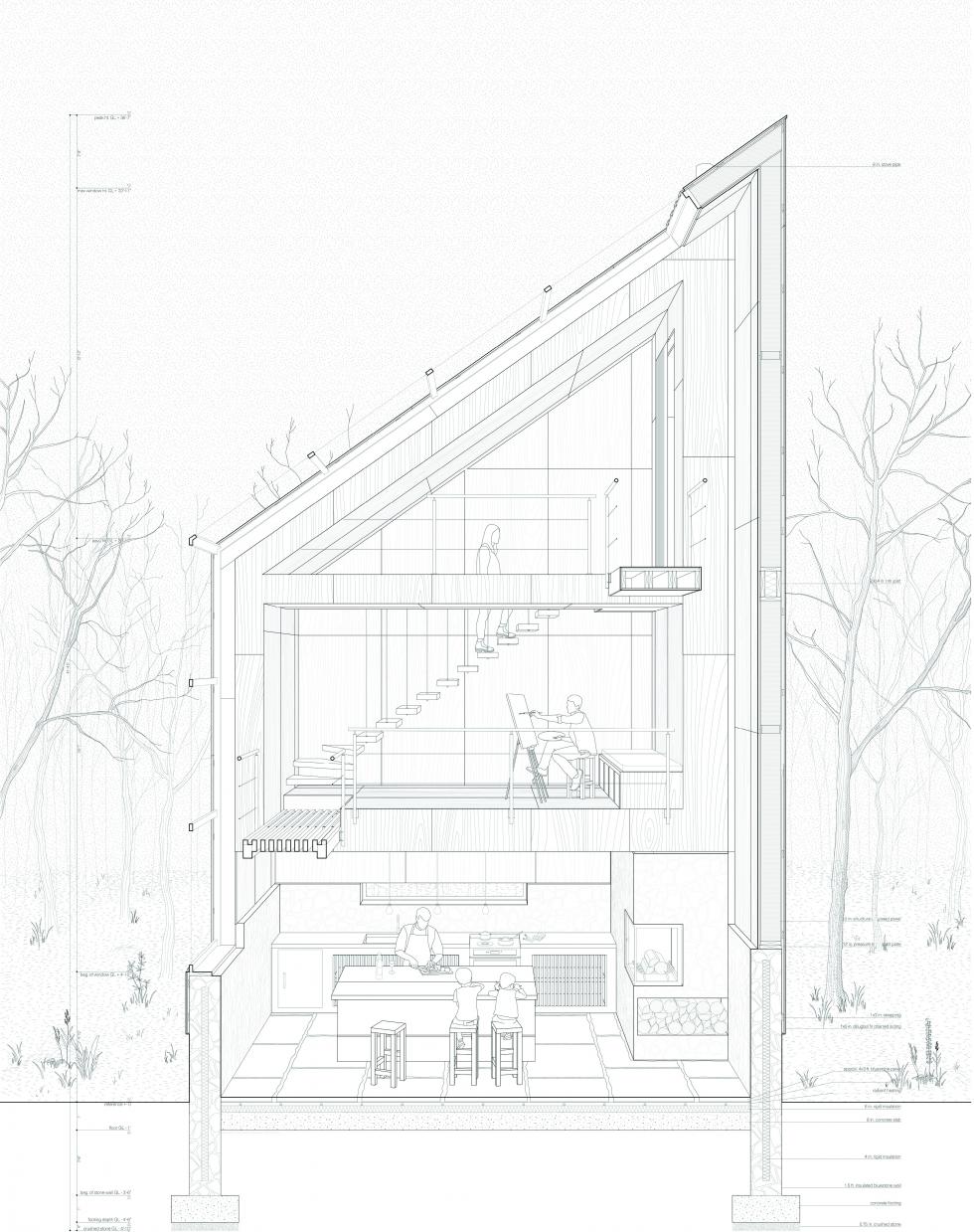 From the outside, the Forest Retreat House sits sculpturally within its surrounding landscape. Minimally perforated on its north, east and south facades, the building presents itself as rather hermetic upon approach. Upon entering, however, one’s perceptions are completely subversed: a triple height, ten foot wide window opens the interior up to the forest beyond. Everything within the house revolves around this opening: the programmatic spaces, though carved into the walls on either side of the window, completely open up the space in between. The functions of the house are divided by floor into the three categories of “live, work, sleep”, and the circulation weaves its way upwards and across each of these, revealing new views onto the forest as one ascends. The house’s materiality also responds to programmatic specificity: stone is the primary material for the ground floor containing the wet spaces, whereas wood is utilized on the upper floors to convey warmth and lightness.