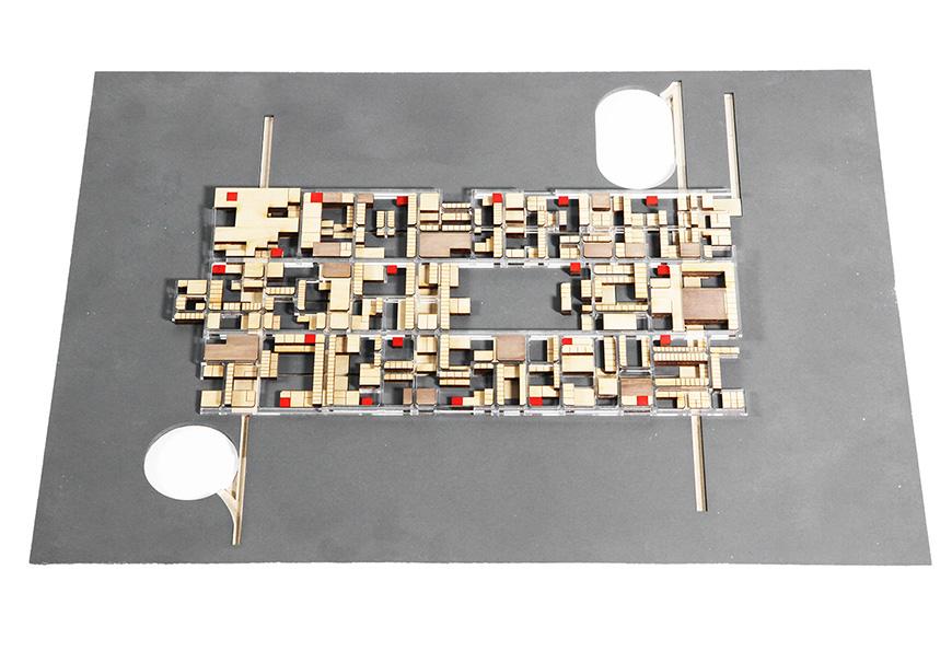 The design of Free University in Berlin — the semester's first design iteration — is used as a case study to foster the understanding of the relationship between building and city and to discover the latent generating methodology. Evolving from the rule exacted from Free University, several attempts are taken and then new series of space is generated. The non-hierarchical feature is kept at the same time retain the spatial identifiability.