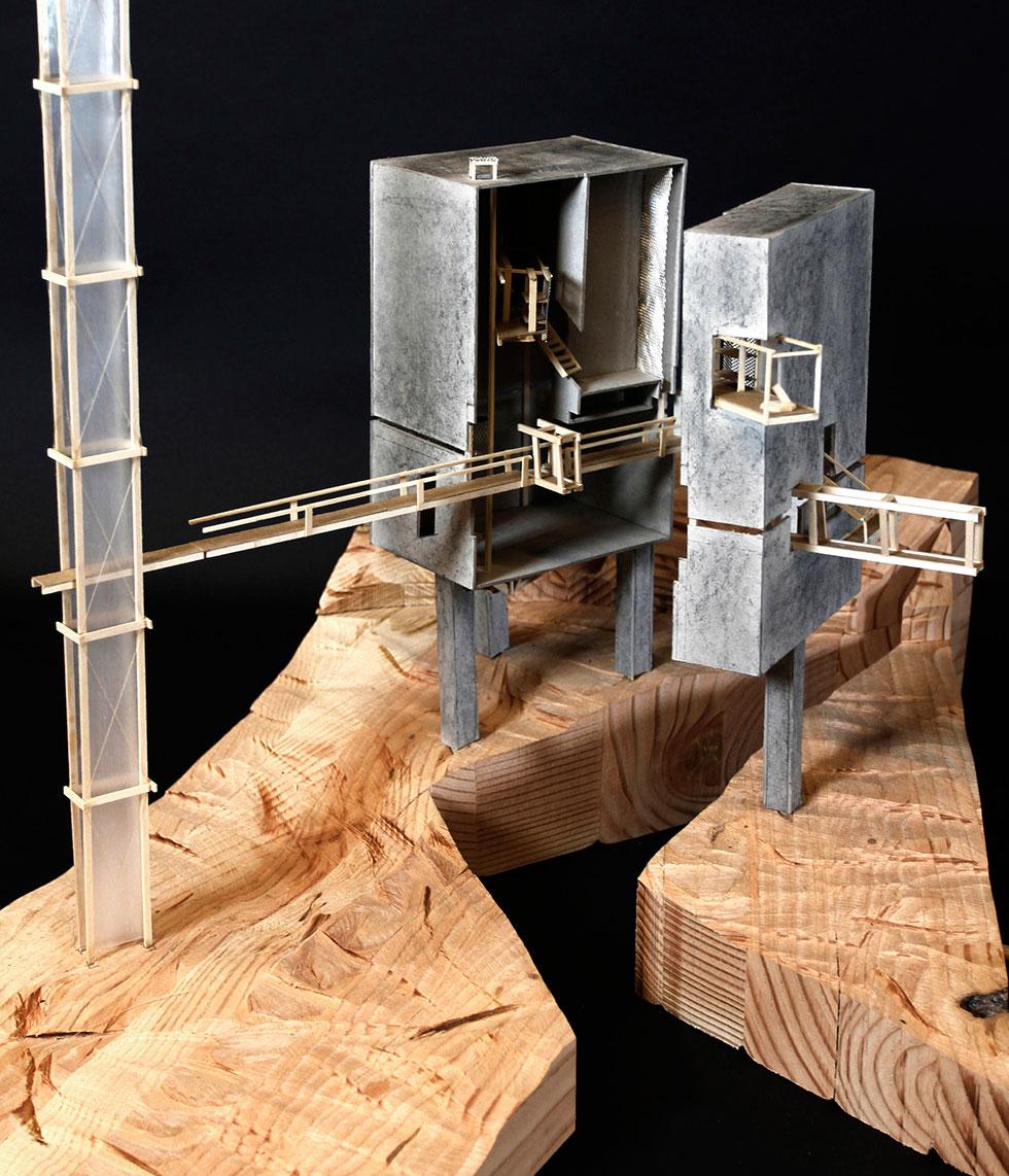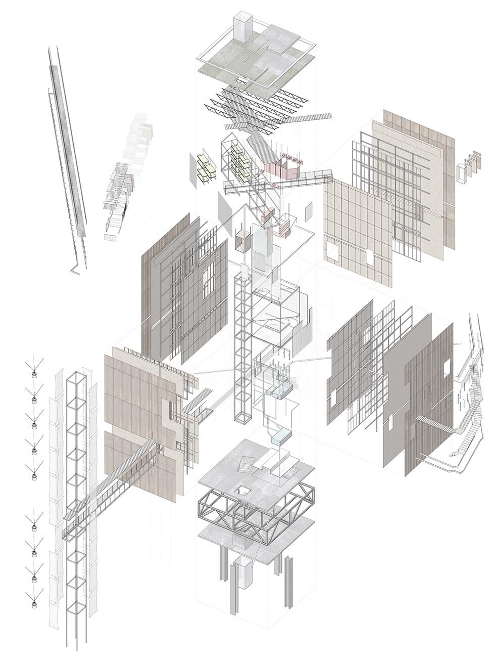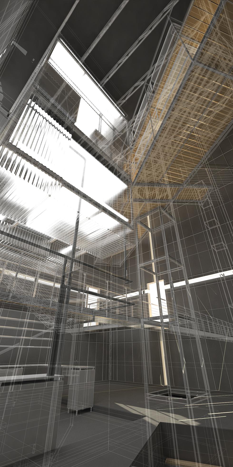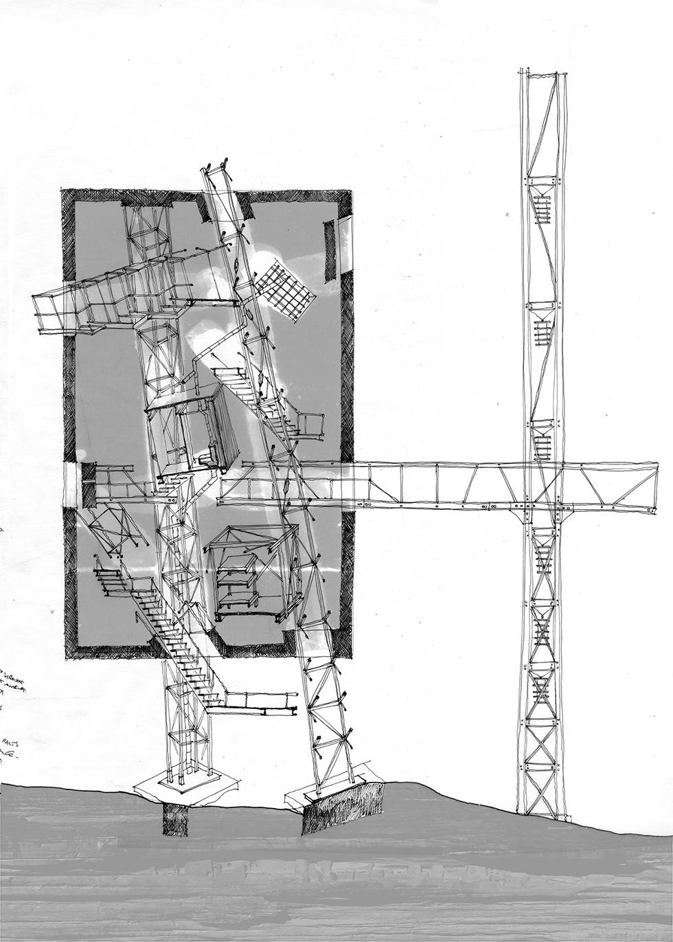 A hiker enters the mysterious shelter from below and looks around to gain his bearings. He realizes that each vector bears a unique function. There is an axis for dining, an axis for sleeping, and an axis for approaching the second tower, which he learns is a functional lighthouse. These axes are far more filigree in their construction than the utilitarian box they puncture, and all extend into the shelter’s surroundings.