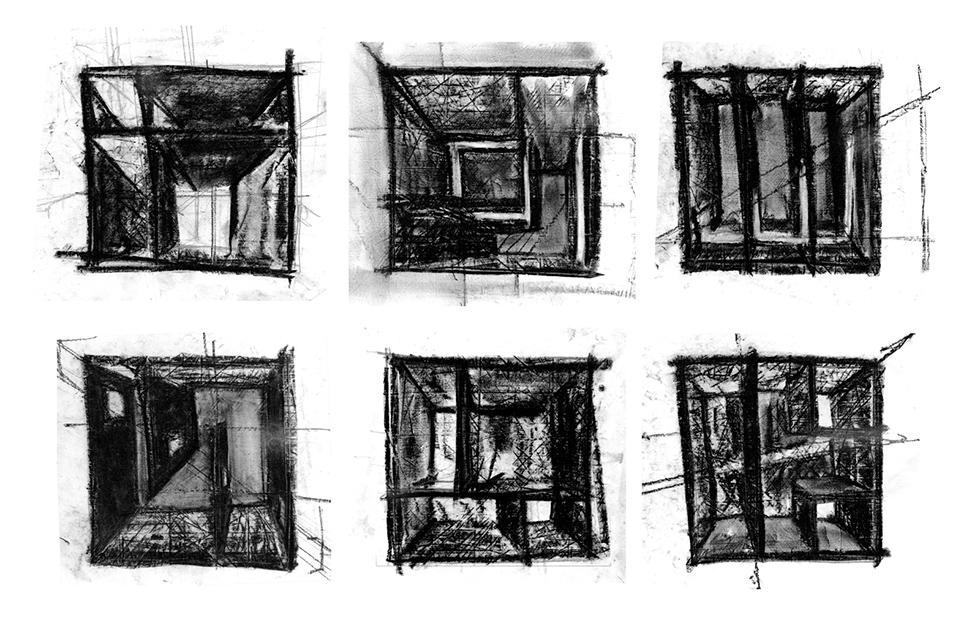 Following the lighting competition, I began the design of a lighthouse and walkers' shelter for the peninsula adjacent to the town of Laxe on the coast of Galicia. I was interested in creating an artifice that seemed alien and introverted from the outside but would actually be punctured by a series of vectors to orient the occupant in the directions of various landmarks on the site. I began with studying how one-move incisions could change the interior condition of a massive container. These studies were first done in charcoal. I then began to understand the nature of randomly puncturing a mass by melting holes through blocks of foam and scanning the resultant sections. By drawing programmatic elements over the scans of the sections, I began to see how these vectors could become architectural elements. Through a series of models and drawings, I assessed the varying success of these once random elements.