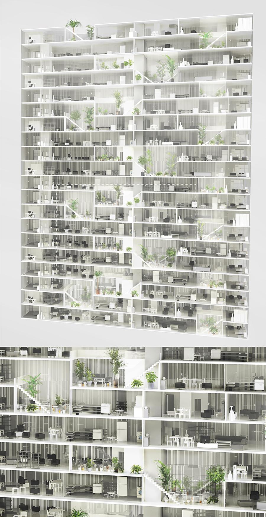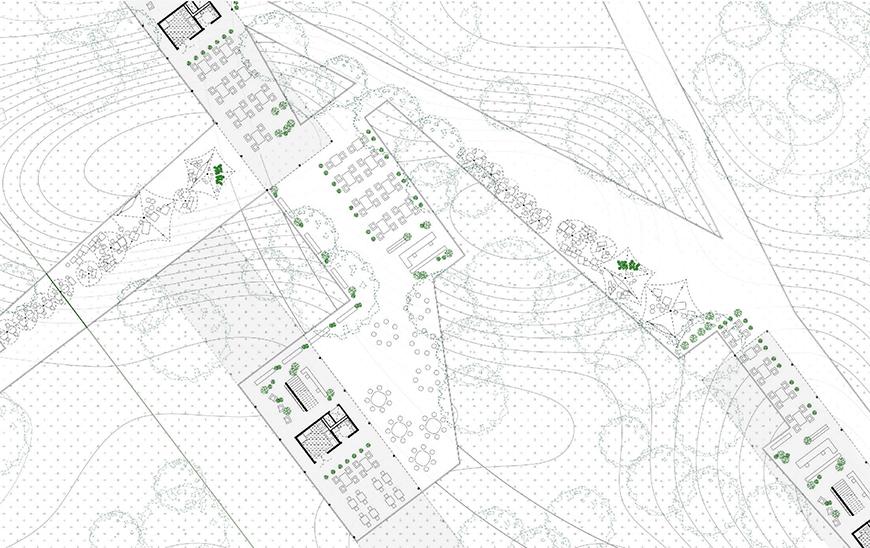 With a main access road, ground-level driveways, upper level network of plinths and piers, and several 20-story slab-towers, a multilayered experience is created in a forest of mangroves.