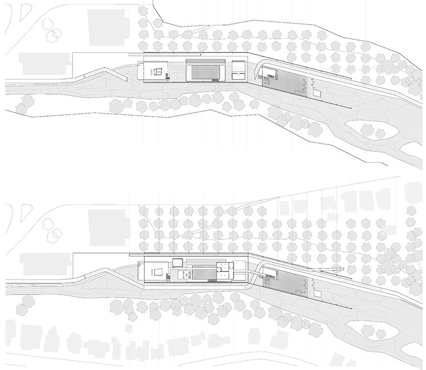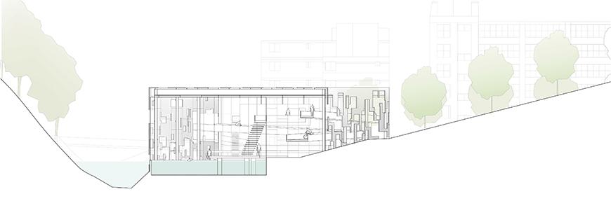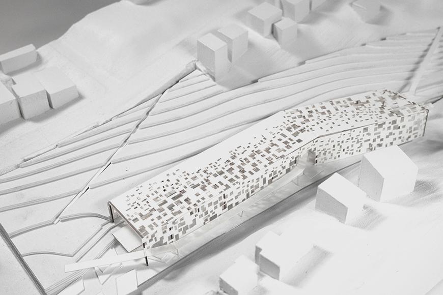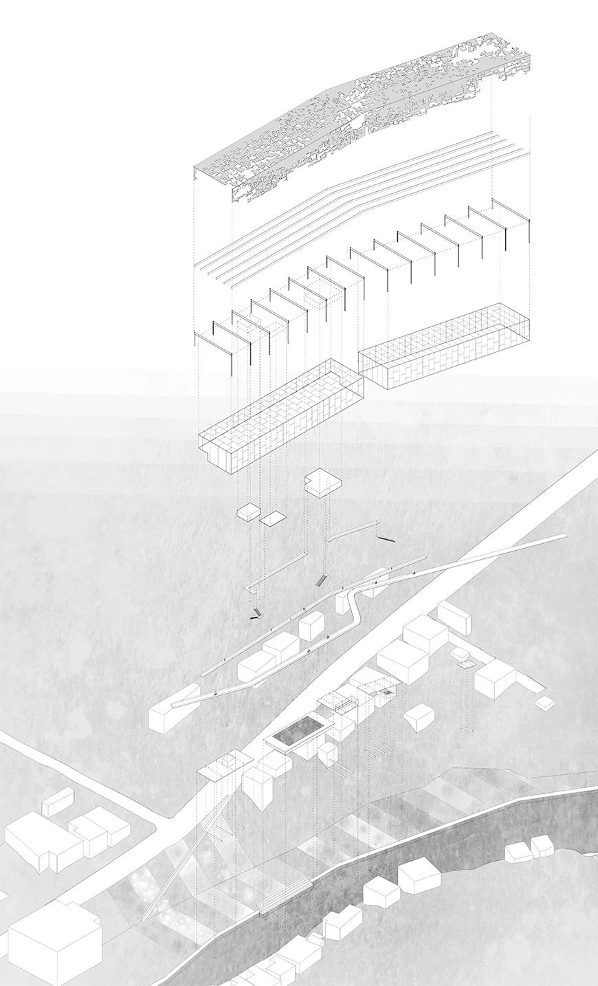 Sited along Six Mile Creek with a forest trail running on the south and State Street on the north, this project mediates between the two conditions of urban and natural context. Utilizing a factorial structural system of rigid frames and being informed by the urban regulating lines, the design slowly adapts to lines traced by the banks of the creek and cliffs of the gorge, also letting the creek's water come into the building. Covered by an envelope inspired by the destroyed shell of a ruined industrial structure with perforations and openings all along, the center also supplies lighting conditions that emulate those of a forest. The design incorporates several separate circulatory ramps for both pedestrians and bikers that oscillate into and out of the structure and tie the complex into the existing city grid.