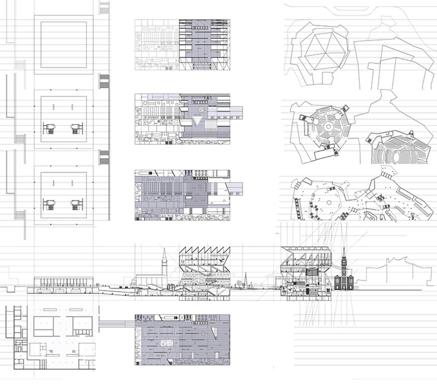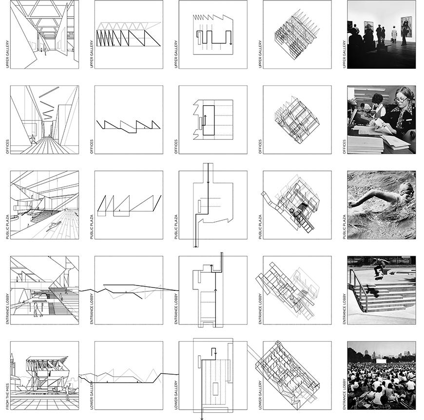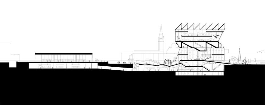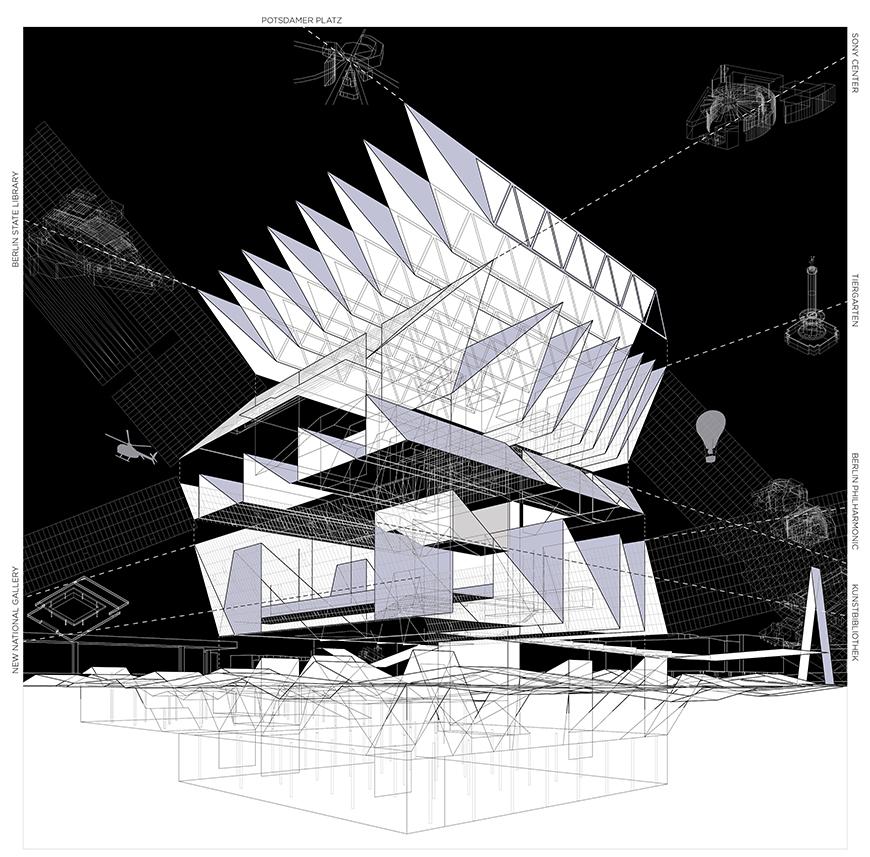 The proposal for the Museum of the 20th Century in Berlin borrows its initial spatial strategy from the adjacent Mies van der Rohe New National Gallery and a constructional affinity to Mies's investigations into steel construction. A series of stacked and initially planar surfaces are subsequently deformed in response to program, site, orientation, and structure. The fold acts as a mediator between the harsh Cartesian rationality of Mies and the lyrical tectonism of Hans Scharoun. The fold is further used as a device, as an operative strategy that allows for the mixing of programs, produces light control, structure, landscape, circulation, roofing, etc. The transformation of the urban landscape further expands this strategy of assimilation and transformation between the two icons as it undulates and stacks to initiate the sequence into the museum. The changing orientation of each plate "collects" the architecture of the city as part of the museum experience. Its crown-like roof allows soft northern light to illuminate the art within. A sequence of ramps and stairs leads to an elevated public plaza at the center of the museum which locates art as central to the urban experience. This pedestal, in turn, elevates the special galleries for maximum views of the surrounding context.
