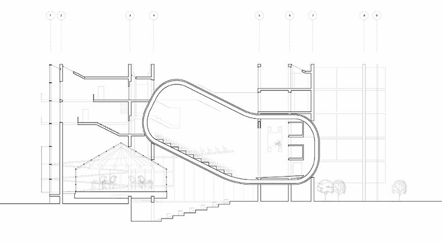 The initial step of the project is to design a game based on a thorough analysis of two housing precedents in Japan and Spain. The game, which adopted a mechanism of key, is about rescuing four animals consecutively from three panels with different degrees of transparency. The idea of transparency is further developed in the housing project located in Binghamton, New York, and translated into the residents' privacy within the space. In addition to the private housing units, two public spaces — a carousel and a theater — are structurally supported by four walls accommodating both vertical and horizontal circulation. The unique sectional quality below the theater is filled by the volume of the carousel and is exposed to the public through both transparent and translucent panels. From each unit, the residents can secretly access their private booths to watch movies anytime without encountering visitors.